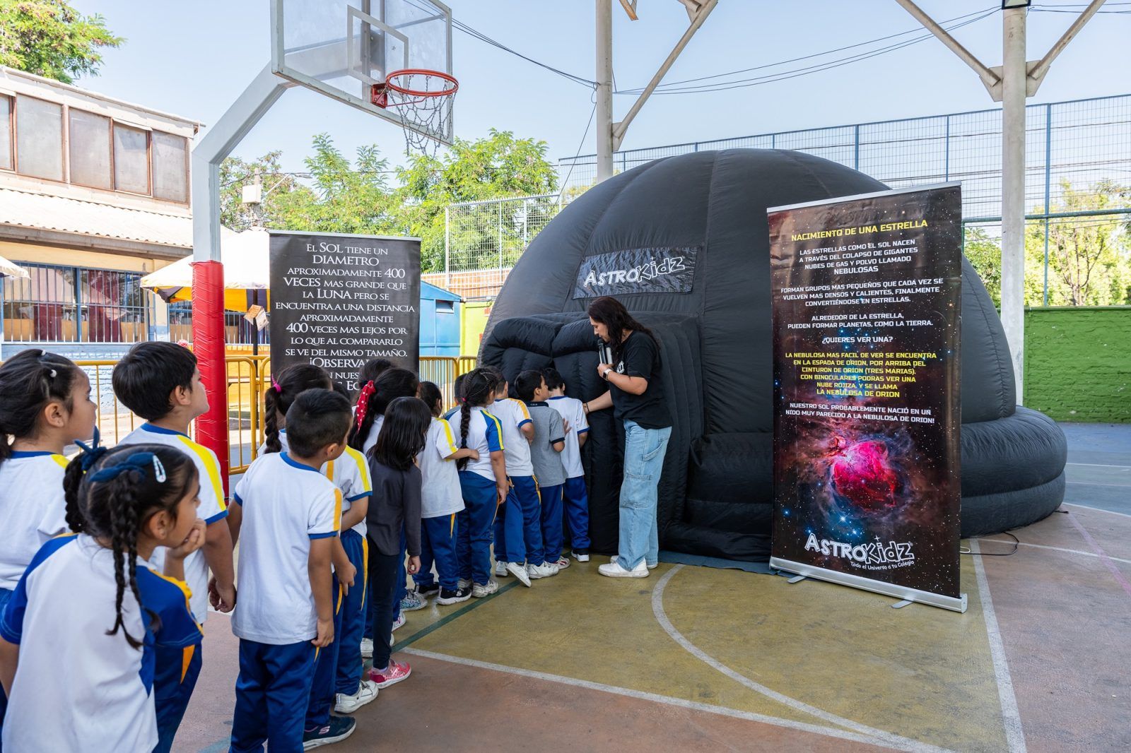 Astrokidz transforma el gimnasio o auditorio del colegio en un observatorio astronómico profesional mediante la instalación de un domo planetario móvil de alta tecnología. La experiencia central consiste en una proyección inmersiva en 360 grados (Fulldome) que permite a los estudiantes visualizar el Sistema Solar, las constelaciones y fenómenos galácticos con una perspectiva espacial imposible de replicar en una pizarra tradicional.